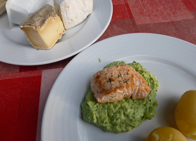 Salz und Pfeffer sowie etwas Crème fraîche zufüge), dazu Frühkartoffeln.