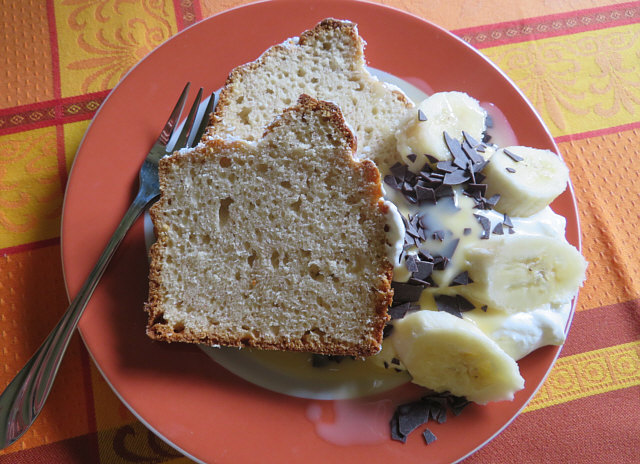Wir haben den Bananenkuchen mit Sahne, Bananenscheiben und