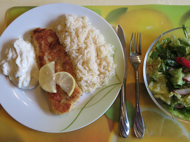 Seelachsfilet mit Tzatziki und Butterreis, dazu gemischter Salat aus