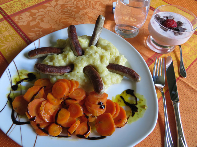 Rostbratwürstchen und Kartoffelpüree mit marinierten Möhren nach einem