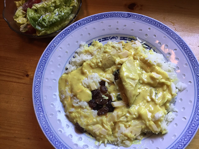 Reis mit Curryhuhn, dazu Rosinen, Käse und Zwiebelstückchen