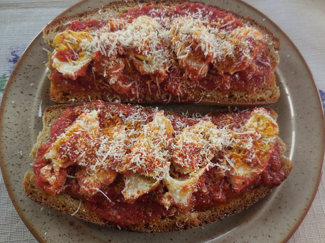Diesmal habe ich Bauernbrot geröstet, die Tomatensauce darauf getan,