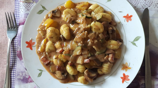 Zucchini zum gar ziehen und Gnocchis zum durchwärmen mit rein.