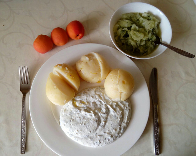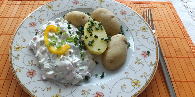 Pellkartoffeln mit selbstgemachtem Kräuterquark und Gurkensalat.
