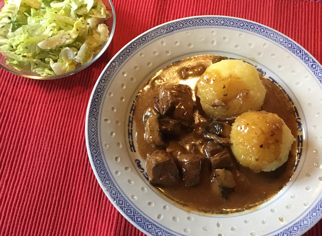 Gulasch mit Kartoffelklößen.
