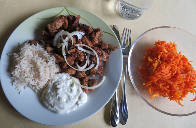 Gyros mit Zwiebelringen, Zaziki, Reis und Möhrensalat.