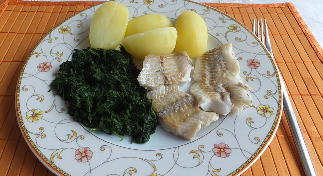 Gedünsteter Blattspinat, Seelachsfilet, Kartoffeln.