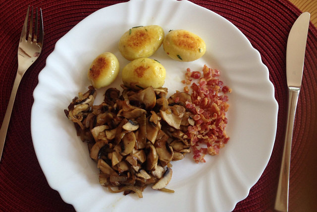 Dienstag die restl. Kartoffeln gebraten mit Pilzen und Speckwürfeln.