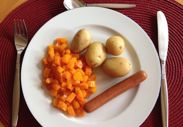 Freitag junge Kartoffeln mit Möhrenwürfeln und Würstchen.