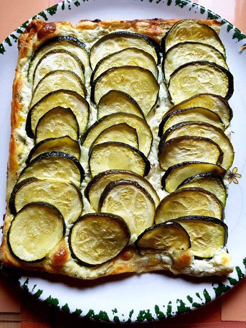 und auf dem Blätterteig verteilen. Darauf die Zucchinischeiben