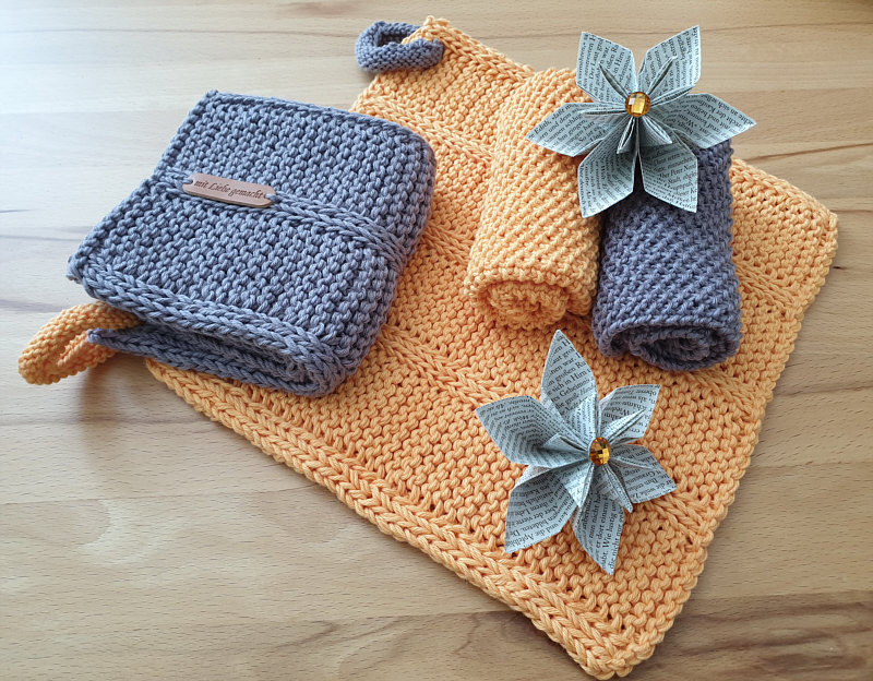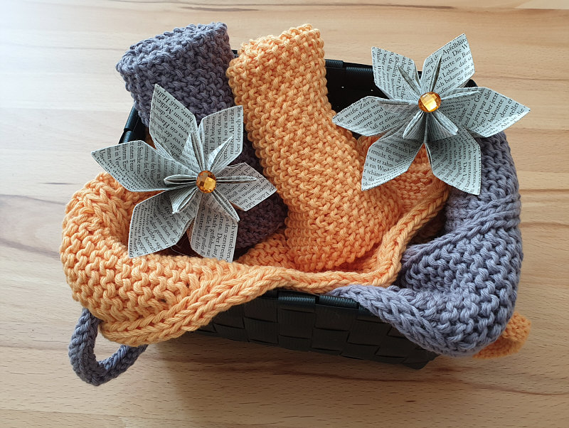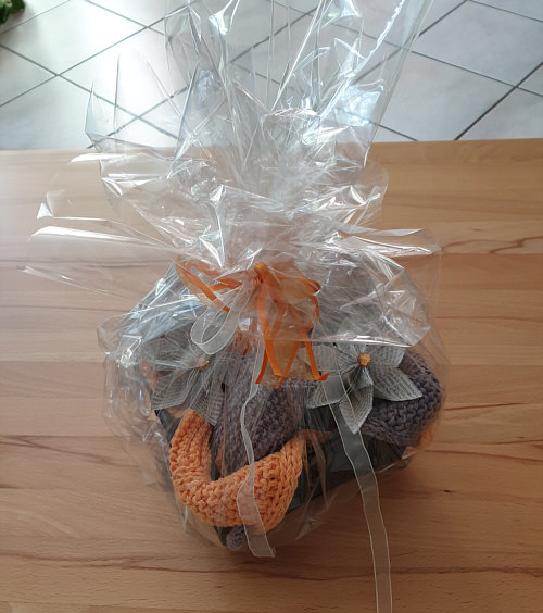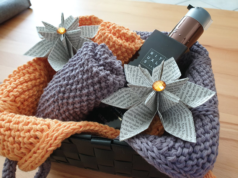 So sieht das Geschenk ... ![]() ... aus, wenns fertig eingepackt ist. Beschenkt wird eine 85jährige Tante. Eingepackt wurden ... ![]() ... gestrickte Topflappen und Spültücher. ![]() Das kommt in ein Körbchen ... zwei Sterne dazu ... ![]() ... natürlich farblich passend mit einem glitzernden Dekoelement. Dazu noch eine gute Handcreme ... ![]() ... und fertig ist das Geschenk. Ich hab jetzt nicht gesagt, wer das Geschenk so kreativ gefertigt hat, aber ich glaube, auch ohne Namensnennung erkennt Ihr auch so die kreative Handschrift der Seelenfärblerin ... es ist Elfi S.. |