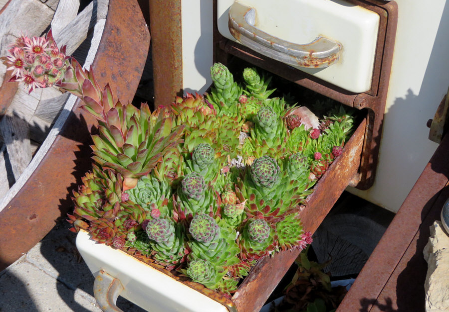 Dort wächst Sempervivum in der offenen Ofenschublade, aus einem alten