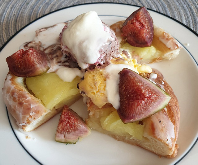 Eine halbe Puddingbrezel mit Eis und cremiger Sahne und frischen Feigen