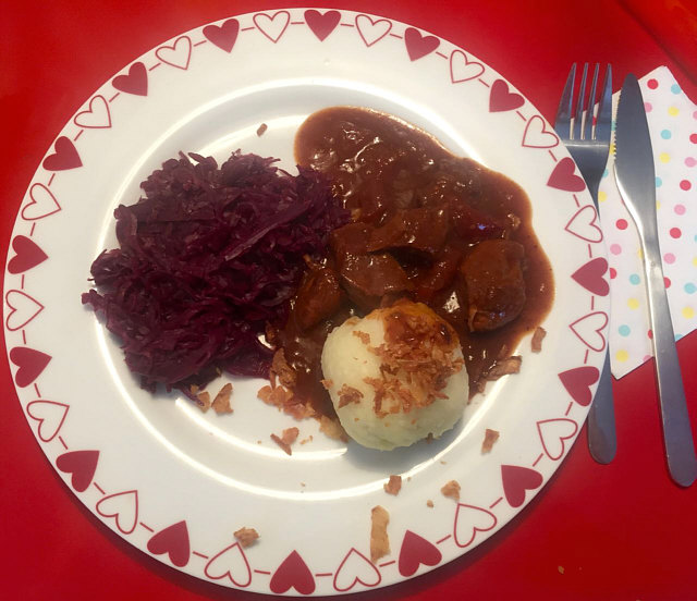 Wunschessen: Gulasch, Rotkohl, Klöße