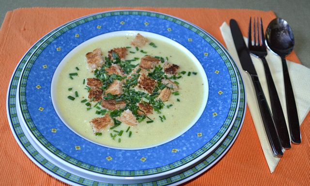 Paprikacremesuppe mit gerösteten Brotwürferl.