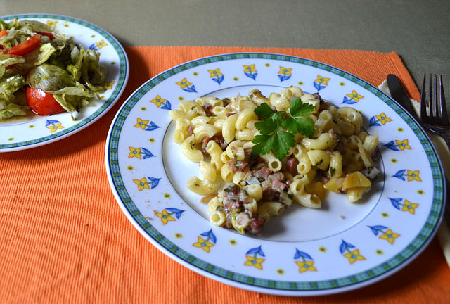 mit Speckwürferl, geriebenem Käse und Petersilie gut gewürzt und mit
