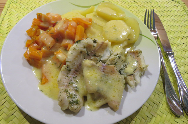 Gedünsteter Seelachs, Salzkartoffeln mit Dillkräutersoße und
