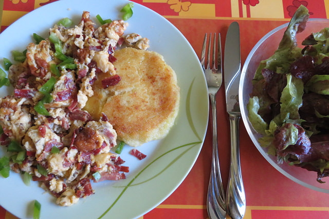 Kartoffelküchlein (paniert gebratenes Pürree vom Vortag),