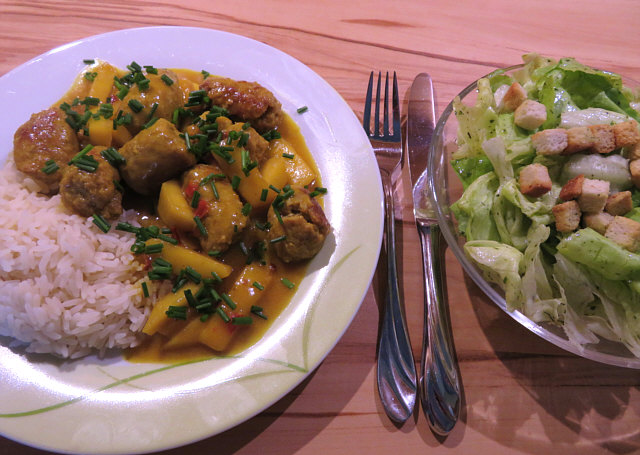 Gebratene Schweinemettklößchen in Curryrahmsoße mit Apfelwürfeln und