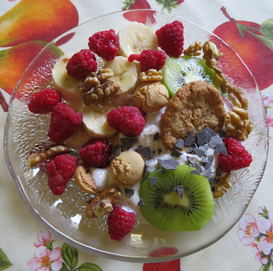 Bananen- und Kiwischeiben, einigen Amarettinis, Walnüssen und wenigen