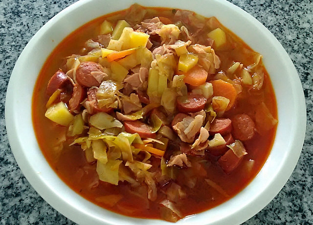 Krautkopf (Weißkohl) in Stücke schneiden, in Zwiebel und Knoblauch