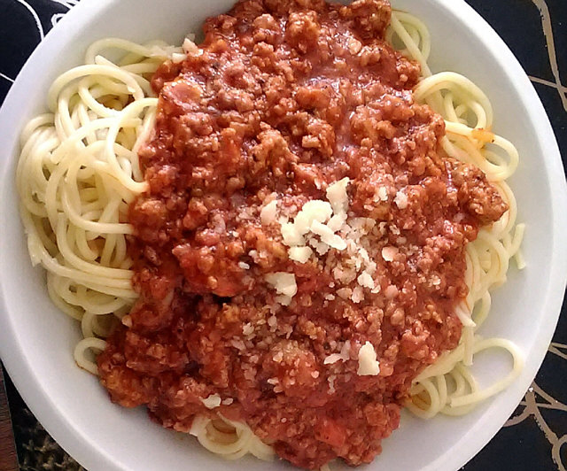 Die Soße mache ich immer aus Hackfleisch, Zwiebel, Knoblauch, Salz,