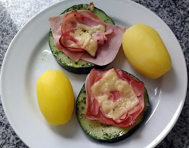 mit Schinknen und Käsescheibe belegen, dazu Salzkartoffeln