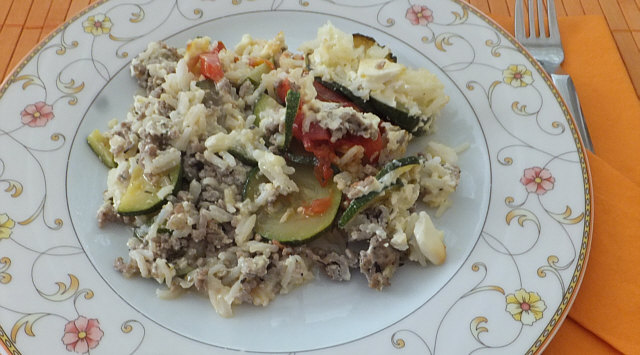 Reis-Gratin mit Zucchini, Feta-Käse, Tomaten, Zwiebeln, Knoblauchzehe,
