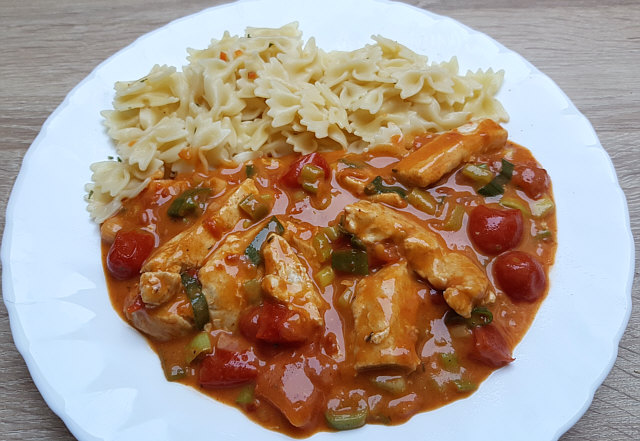 Putengeschnetzeltes mit Zucchini, Lauchzwiebeln und Kirschtomaten, dazu