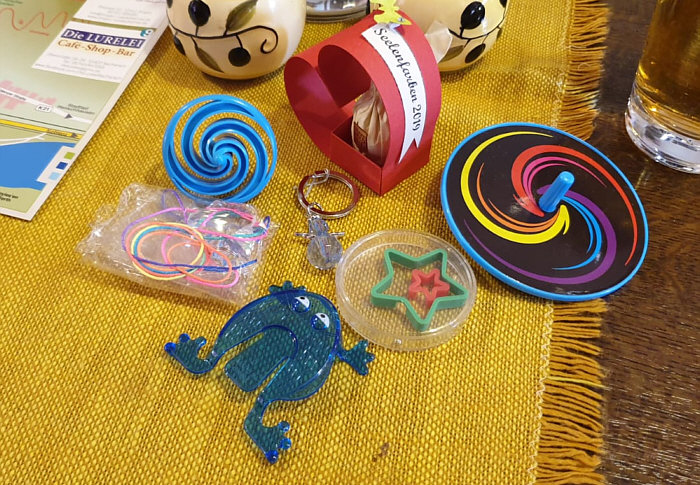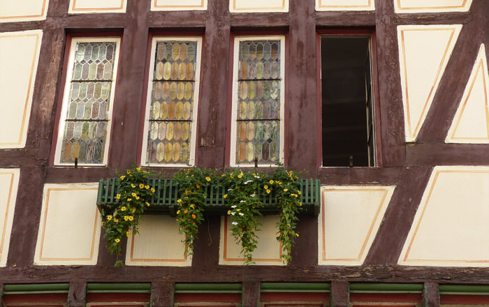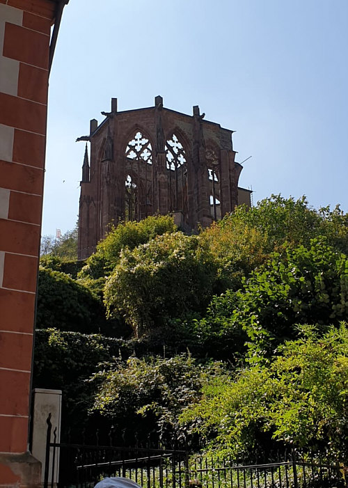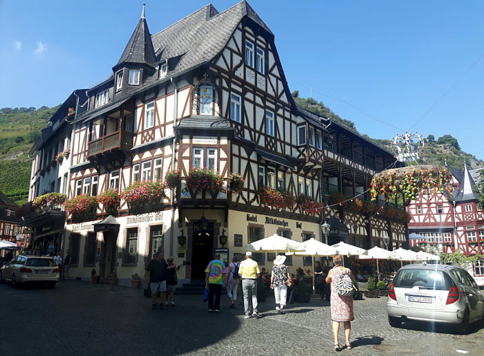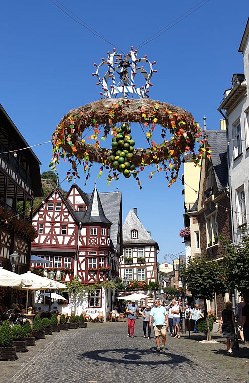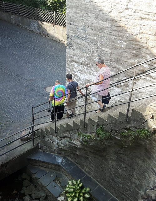 Seelenfarbentreffen in ![]() Teil 2 Heute gibts hier ein buntes Sammelsurium von Eindrücken rund um das Seelenfarbentreffen in Bacharach, damit alle, die dabei waren, sich erinnern können und alle, die nicht dabei waren, dennoch ein wenig dabei sein können :). Die Bilder wurden von den Teilnehmern des Treffens fotografiert und sie sind bunt gemischt, es ist mit allem zu rechnen ;). ![]() Bacharach ist ein schönes Fachwerkstädtchen ![]() Es gibt eine erhaltene Stadtmauer, auf der man laufen kann. Der Weg führt direkt an Häuserwänden vorbei, denn die Stadtmauer ist überbaut worden. So sieht also der Stadtmauerweg aus. ![]() Das ist der Postenturm, ein Rest der Stadtmauer. 1899 wurde er als Wasserturm wiederhergestellt. "Posten" deswegen, weil die bekannte Weinlage, in der er steht, so heißt. Man kann den Turm besteigen und hat von oben eine tolle Aussicht. ![]() Das ist ne Harley mit tollem Mattlack ... wir haben sehr viele Motorräder gesehen an diesem Tag. Die Stadt hat ja keine Fußgängerzone ... durch die eine Straße, durch die alle gehen fließt auch ziemlich viel Auto- und Motorradverkehr. ![]() Diese Fünf müssen natürlich immer dabei sein. ![]() Ein besonders schönes Fachwerkhaus ![]() Bacharach liegt am Rhein und dort waren wir natürlich auch. ![]() Treppe in Richtung der Burg Stahleck ![]() Treppe vom Stadtmauerweg nach unten ... ich kann Euch sagen, diese Treppe war nicht ohne. ![]() Kleine Geschenke ![]() Noch mehr kleine Geschenke ![]() Offizielle gemeinsame Bärenbegrüßung und Besichtigung des Probefahrt-Autos ![]() Eine Krone wirft ihren Schatten ![]() Vom Postenturm aus hat man diesen Blick. Das ist ein Wikipedia-Bild, wir Seelenfärbler sind da nicht hochgelaufen. Rechts auf dem Bild sieht man eine Kirchenruine ... ![]() ... das ist die Wernerkapelle, die ... ![]() ... im Jahre 1830 auch schon eine Ruine war. ![]() Ein Hotelschiff ... möglicherweise macht es eine Flußkreuzfahrt. ![]() Ein Containerschiff und der Blick ins Rheintal ![]() Dieses Geschäft macht Urlaub ... ![]() ... und es hat Angst, dass man mit Klopfen versucht, den Urlaub zu beenden. Jetzt wissen wir auch, wie "bitte nicht klopfen" auf japanisch heißt. Doch, in Bacharach findet man durchaus Japaner auf weiter Reise, schließlich liegt die Stadt im UNESCO-Welterbe Oberes Mittelrheintal. ![]() Guckstdu ? ![]() Schöne alte Bleiglasfenster in einem denkmalgeschützten alten Winzerhof. Erbaut 1438-1450, eines der ältesten Häuser in Rheinland-Pfalz. ![]() Ein altes Küchenschätzchen ![]() Stillleben ![]() Am Rande des Stadtmauerwegs ... kleine, edle Auszeitecke ... leider ist die Bahnlinie gleich daneben und der Blick zum Rhein ist nicht wirklich frei. ![]() Mal ein Blümchen zwischendurch ![]() Blick vom Stadtmauerweg aus nach unten ... und das an einem heißen Tag mit mehr als 30 Grad. Ich wär fast reingesprungen ;). ![]() Die Josefskapelle ... sie sieht innen ... ![]() ... so aus ... und manche haben ... ![]() ... ein paar Kerzen angezündet. ![]() Ein Frosch ![]() Da hat noch jemand in Bacharach einen wundervollen Tag erlebt. Über 30 Bilder ... das ist jetzt wirklich wie "mittendrin dabei gewesen" :). Es wird noch eine dritte Folge geben, dort gibt es dann das Gruppenbild und die Einzelbilder zu sehen. |