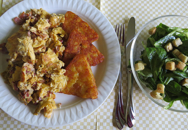 Rühreier mit Speck, Röstis und Feldsalat