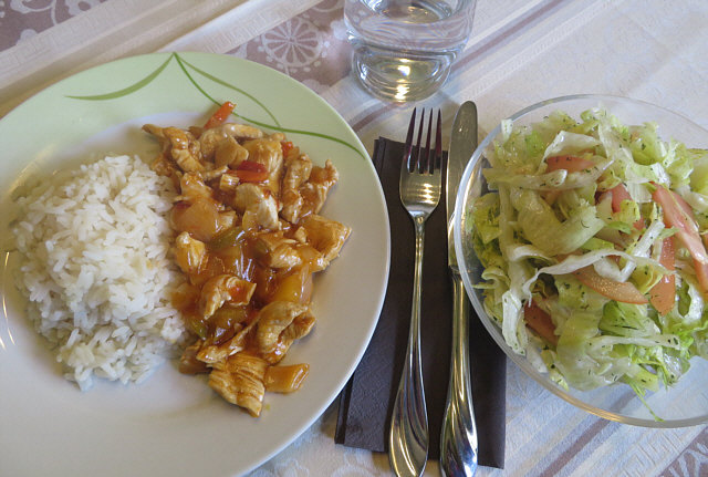 Chinapfanne süß-sauer mit Putenfleisch und Reis, dazu Eisbergsalat mit
