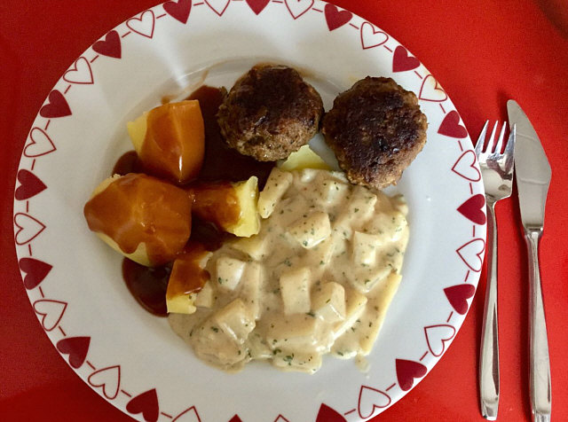 Frikadellen, Kohlrabigemüse und Salzkartoffeln mit Bratensoße à la Oma