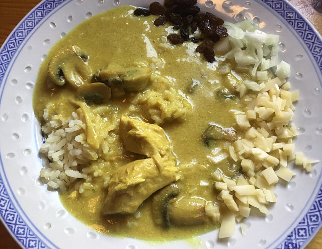 Bei uns gab es mal wieder Curryhuhn mit Beilagen: Rosinen, rohe Zwiebeln