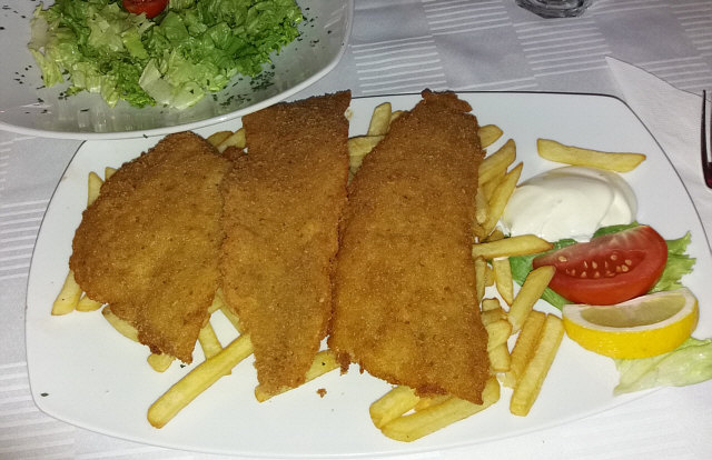 einen gebackenen Seehecht auf Pommes und Salat gegessen.