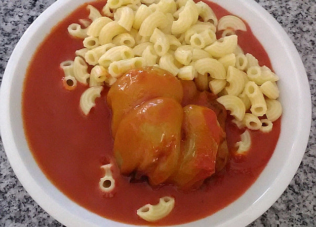 Gefüllte Paprika mit Tomatensauce und Hörnchennudeln