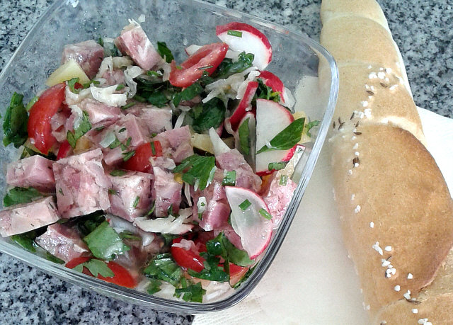 Bunter Sülze-Salat mit Radieschen, Paprika. Tomaten Kräutern und einem