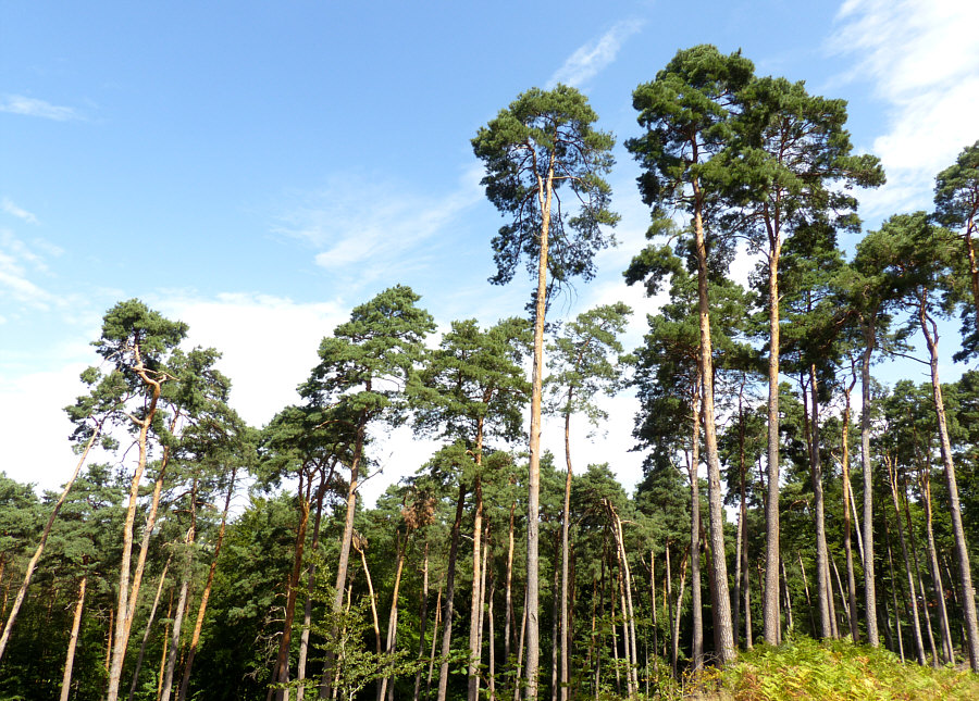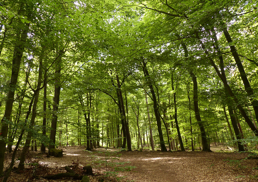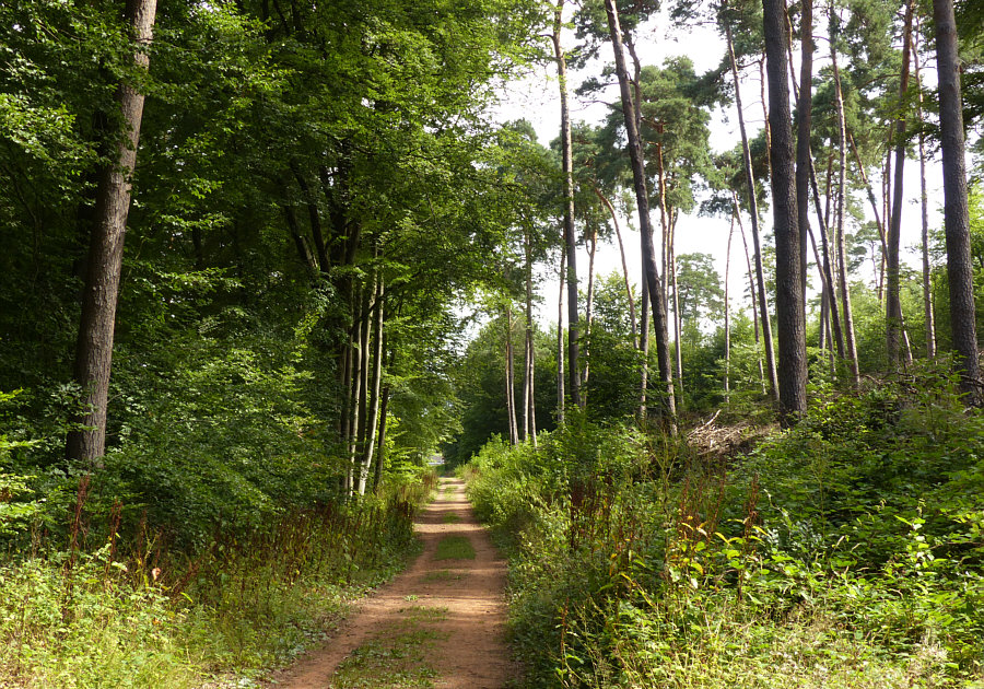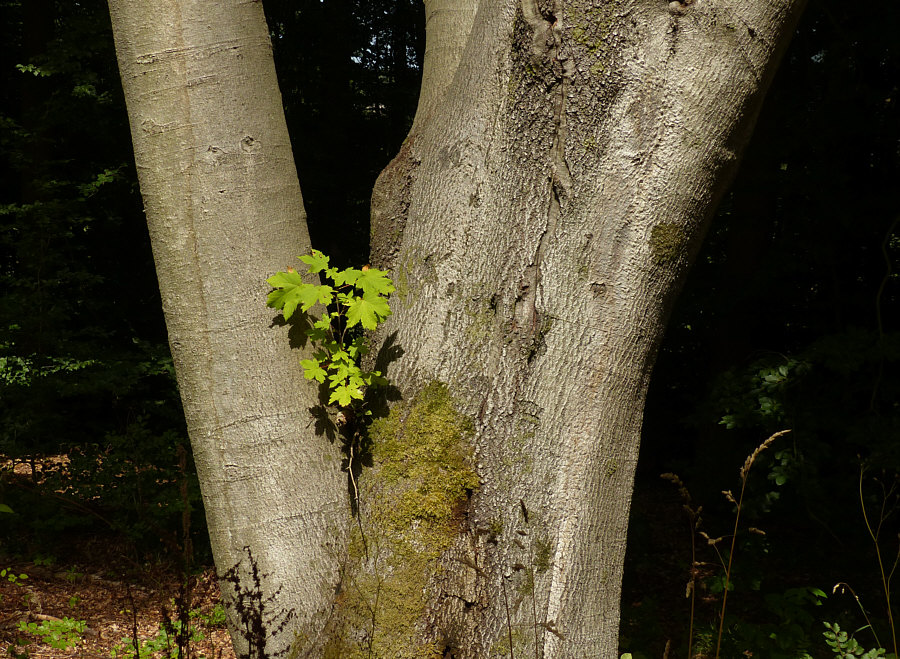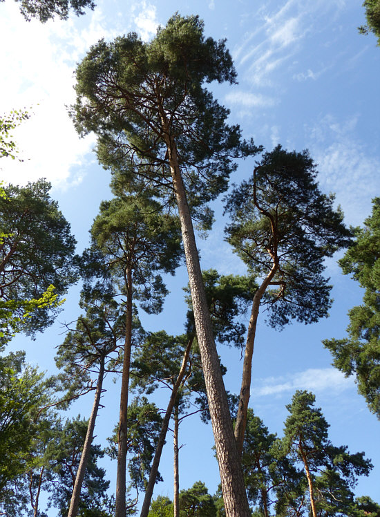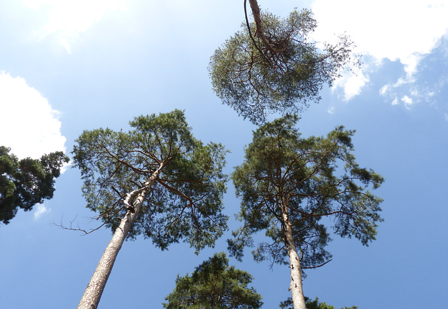 Wege ... ... die Beate und ich in den letzten Wochen gegangen sind ... ... und die ich heute zeigen muss, denn bald passen eher grüne Wege nicht mehr in die Jahreszeit. Auch wenn es wirklich schon etwas länger her ist, so will ich Euch den folgenden Weg auf jeden Fall zeigen. Weil er etwas anders war als die Wege, die wir sonst so gehen. Nicht so lauschig, mit mehr Sicht ... und mit Kiefern. ![]() Natürlich nicht nur Kiefern ... unsere Wälder sind ja Mischwälder. Hier zwei Ahörner ... ![]() ... mit Kind ... und es folgt die Erinnerung an Zeiten, die noch grün waren: ![]() Vielleicht tut so viel Grün gut, wenns draußen grau und naß ist. Aber auch dann, wenn noch alles grün ist, gibt es Stellen, die ganz anders sind: ![]() Eine Minute nach dem Grün fotografiert ... so schnell kann sich das Bild ändern. Ein paar Meter gehen ... und dann zurück schauen ... ![]() ... da sehen wir dann rechts die dürren Äste hinterm Grün liegen. Der Weg steigt nun an bzw. wir biegen auf einen ansteigenden Weg ab ... ![]() ... rechts wieder die Kiefern ... bei diesen Bäumen lohnt sich ein Blick nach oben: ![]() Der Blick wird weiter ... ![]() ... und wir schauen mal nach oben ... ![]() ... und nach rechts zum Waldrand: ![]() Wir laufen weiter ... blicken zurück ... ![]() ... da vorne steht etwas, was zumindest in unseren Wäldern selten geworden ist: eine Bank. Eine Bank an sich ist schon selten ... eine die noch einigermaßen in Ordnung ist, noch seltener. Der Wald wird nun grüner und dichter ... ![]() ... und links auf dem Bild sehen wir ein Sammelsurium ... ![]() ... von Altholz, Blättern, Nadeln ... ![]() ... Moosen und Flechten. Natürlich bleibe ich hier stehen und fotografiere: ![]() ![]() Hach ... was war das damals für ein schöner sonniger Tag ... ![]() ... im Moment ist ja mit Waldspaziergang nix, wegen des vielen Regens. Auch wenn der aufhört, dauert es noch ein paar Tage, bis die Wege abgetrocknet sind. Manchmal wächst auf dem Weg, mitten im alten Laub, Gras ... ![]() ... das dann, wenn man die Kamera tiefer hält, anders und schöner aussieht: ![]() Dieses Bild hat auch seinen Reiz als Schwarz-weiß-Bild: ![]() Der Abschluss ist natürlich wieder grün ... ![]() ... mit dem Gefühl, unter einem grünen Dach zu stehen. |