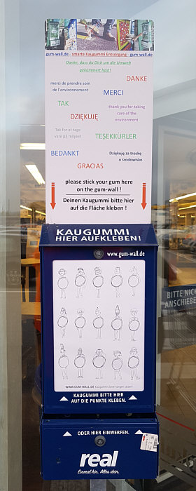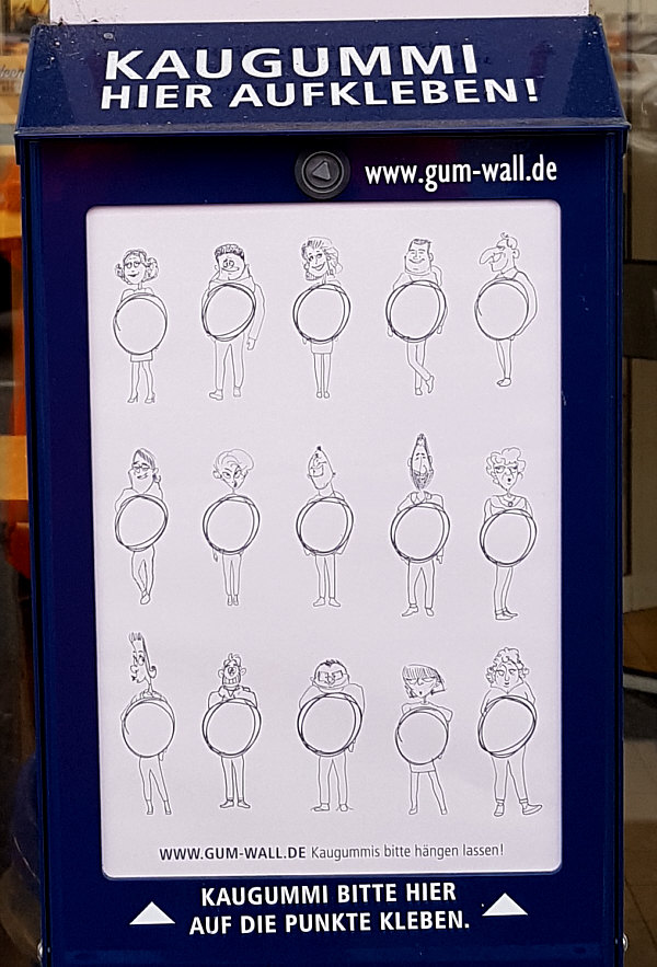 Ein bisschen ekelig heute ... aber auch menschlich. Und den Kiefer stärkend ;)). Erinnert Ihr Euch noch an die Schulzeit ... wenn man da mal gedankenverloren, an die Unterseite des Schultisches gefasst hat ... diese Knubbel ? Die verhärteten Kaugummi-Erinnerungen an alte Zeiten. Oder an den Moment, wenn man in einen frischen Kaugummi getreten ist und sich gewünscht hätte, er wäre schon hart gewesen. Ist ja an sich nix dagegen zu sagen ... Kaugummi gibt es zu kaufen, er regt den Speichelfluss an, beruhigt, trainiert. Über seinen Geschmack kann man streiten ... lange währt der eh nicht. Ich bin jetzt so gar kein Freund von kaugummikauenden Kassiererinnen an der Kasse. Das "törnt mich sehr ab" oder so. Ich gehe mal davon aus, dass es ganz bestimmt Seelenfärbler(innen) gibt, die manchmal, öfter, regelmäßig Kaugummi kauen ... sagt mir doch mal, was für Euch positiv am Kaugummi kauen ist. Wie gesagt ... er wird ja schnell fad im Mund. Und dann gibt es ganz unterschiedliche Reaktionen. Da ja heute die wenigsten eine Schulbank zum Drunterkleben in der Nähe haben, machen sie was mit dem Kaugummi ? Viele spucken ihn einfach aus. Manche schlucken ihn, aber das sind eher Unfälle ;). Nettere Menschen wickeln ihn in ein kleines Stück Papier und dann kommt dieses in den Papierkorb. Für die potentiellen Spucker hat sich ein Real da mal etwas ausgedacht: ![]() Erstmal wird sich höflich bedankt ... vielleicht liest das der Betroffene ja noch mit Gummi im Mund. ![]() Und dann darf sie oder er zielen ... ![]() ... und einem Männlein oder Weiblein auf den Bauch kleben. Unten steht "Kaugummis bitte hängen lassen" ... ähm, bitte, wer klaubt die denn wieder ab ? Darunter ist, falls oben voll ist ... ![]() ... eine Art Briefkasten für Kaugummis. Darin steht eine Alu-Schale. Therotisch ist das bestimmt eine gute Idee. Aber ich glaube, dass sie scheitern wird ... weil die Menschen ... so sind wie sie sind. Oben hat schon jemand ein Preisschild drauf geklebt ... und in der Alu-Schale ... ![]() ... liegt schon der Müll. Ich werde da in ein paar Tagen nochmal vorbeikommen und nachschauen. Das heutige Kalenderblatt-Thema: Kaugummi ... kauen ... und entsorgen. |