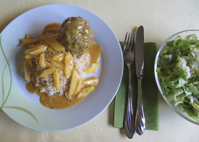 Rinderhackkloß in Currysoße mit gedünsteten Apfelstückchen und Reis
