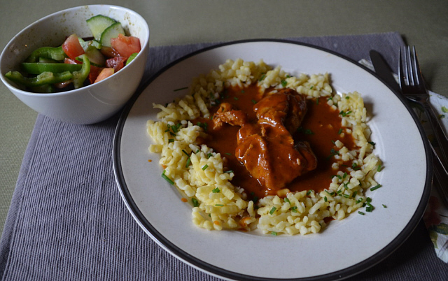 Paprikafleisch mit Spätzle und Salat
