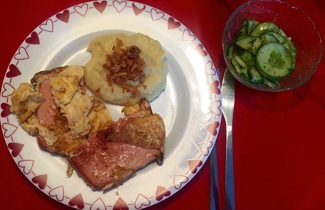 Leberkäse mit Rührei, Kartoffelpüree, Röstzwiebeln und Gurkensalat