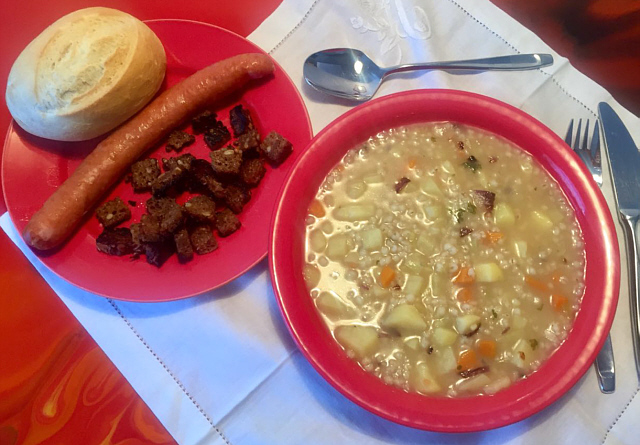 Graupensuppe mit Mettwürstchen, Croutons und Brötchen