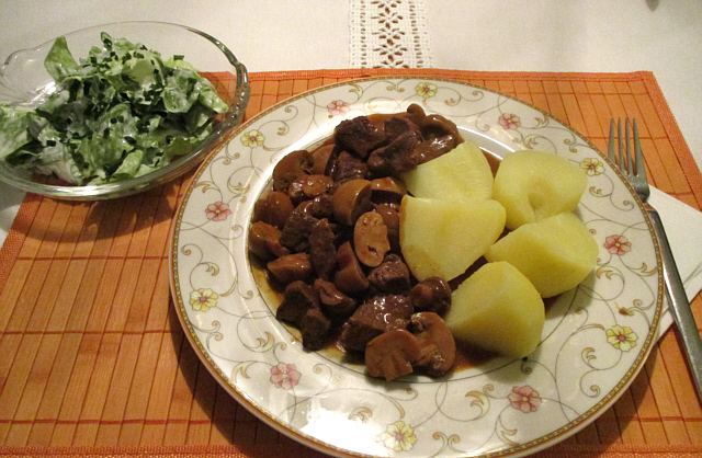 Rindsgulasch mit ganzen Pilzen und Endivien-Salat.