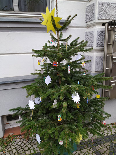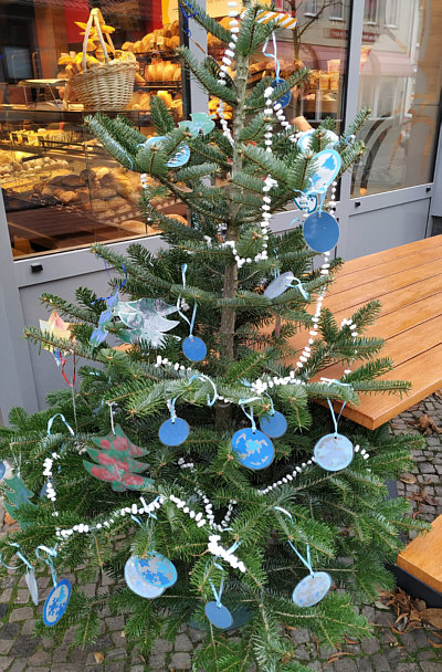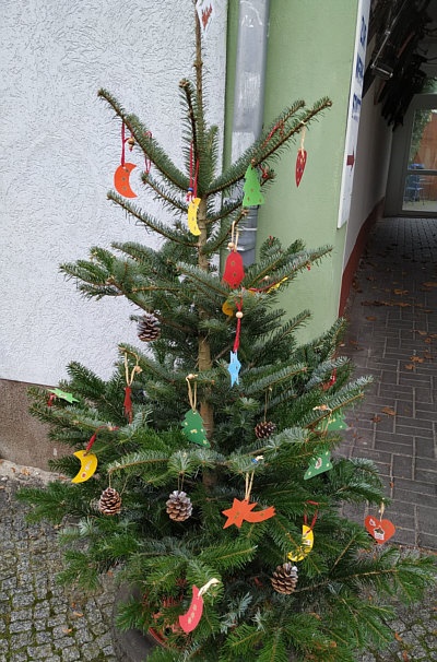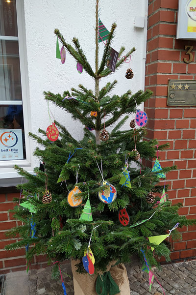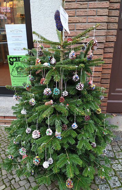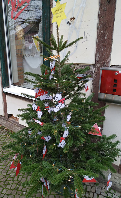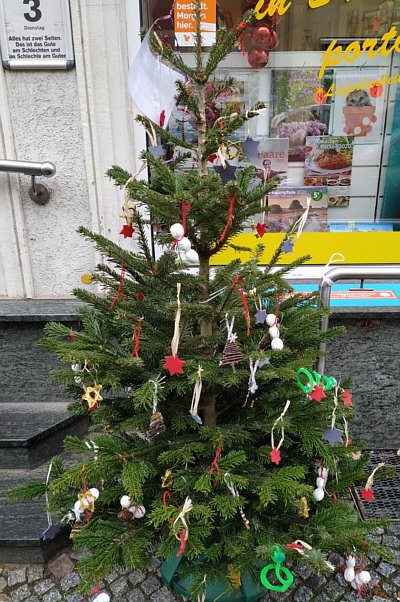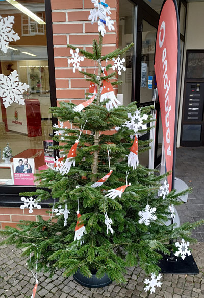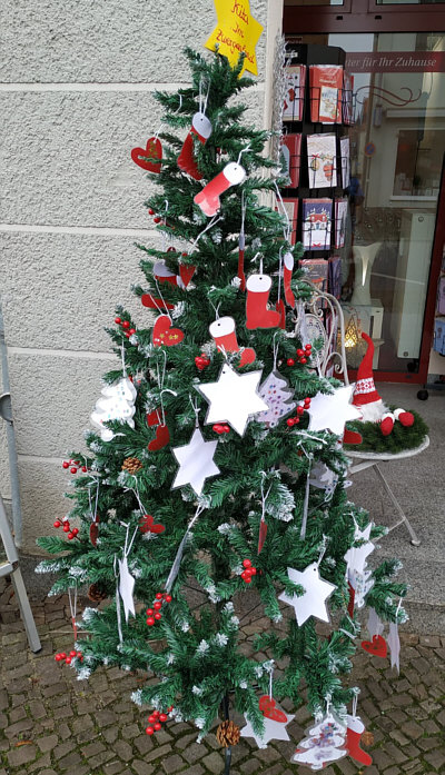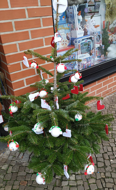 die von Kindern geschmückt wurden, vor den Geschäften der Stadt gesehen.