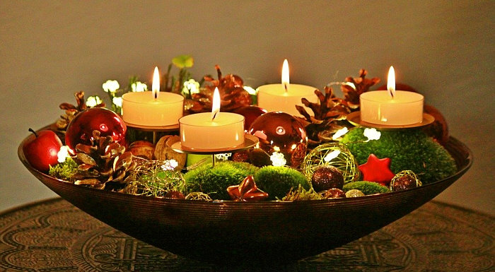 Das ist für mich eine gefüllte Schale, weihnachtlich dekoriert mit vier Kerzen.