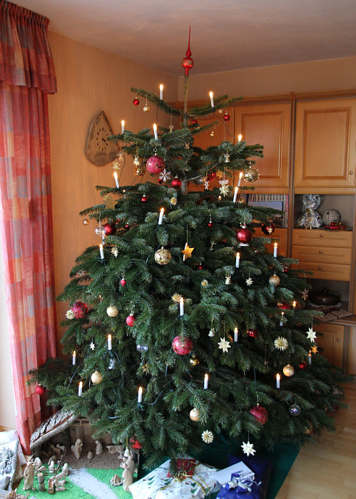 Lichter, welche Spitze) ? Ich liebe die Traditionsfarben Rot und Gold, die Spitze ist rot, und zusätzlich finden noch kleine Geschenke (Sterne, Engel, Kugeln) aus den vergangenen Jahren ihren Platz am Baum, die Beleuchtung ist elektrisch. ![]() |