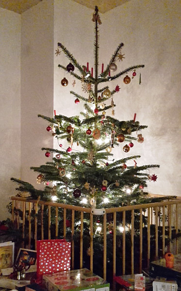 ? Bei uns gab es keine echten Kerzen, als wir Kinder waren. Seit ich einen eigenen Christbaum schmücke, hängen an dem ein paar wenige echte Kerzen. Die dürfen am Heiligen Abend brennen. Immer mit einem bisschen komischen Gefühl dabei, aber es sieht einfach so toll aus. Selbst mit ganz kleinen Kindern wollten wir uns das nicht nehmen lassen. Zweimal stand der Christbaum im Laufstall ... ![]() ... um ihn vor den ganz kleinen Kinderhänden zu schützen. |