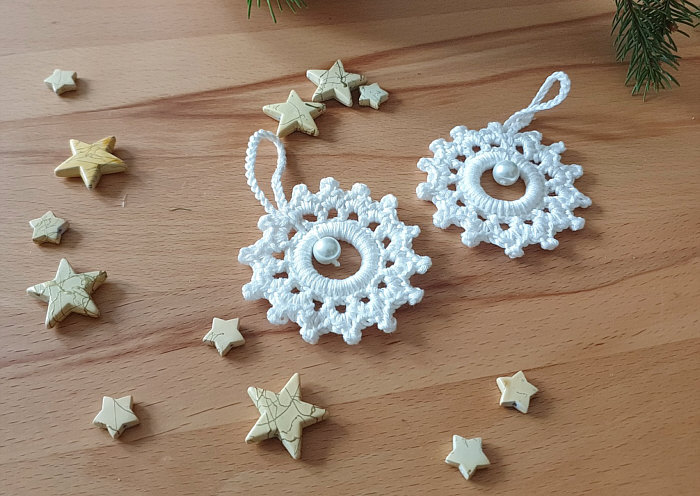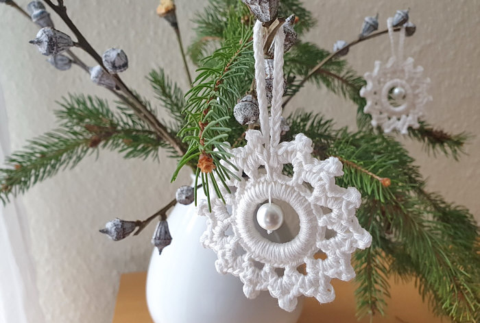 Die Gardinenringe werden umhäkelt und teilweise zusätzlich mit einer Perle