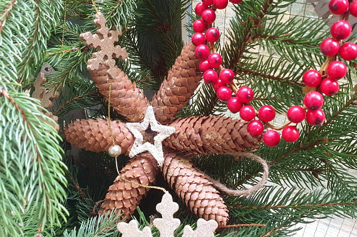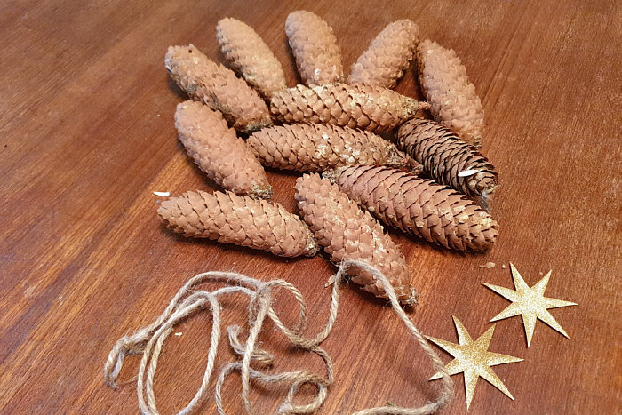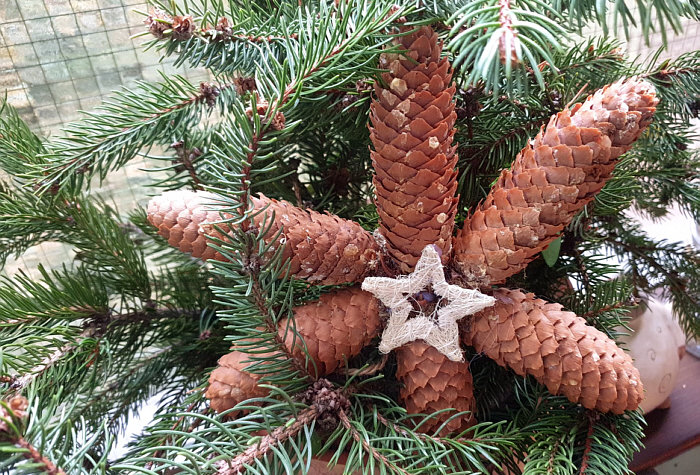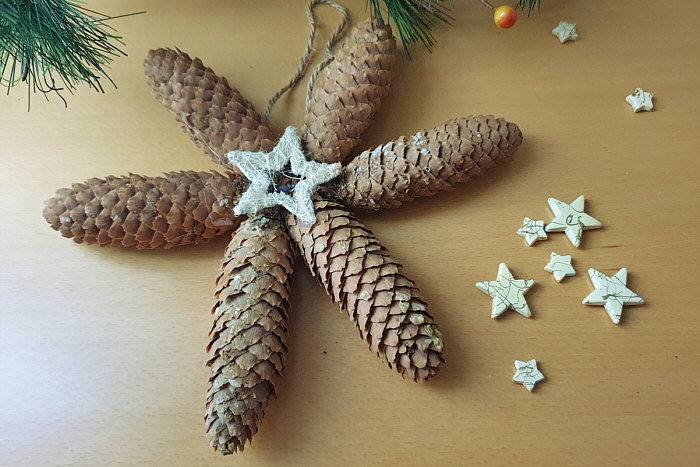 Es wurden 6 Zapfen zu einem Stern geklebt und in der Mitte verziert.